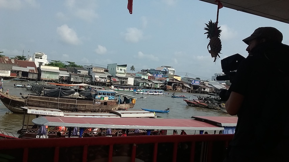 Filming at Cai Rang floating market. The market sells varieties of fruits, when we visited, mostly watermelon and pineapple. There are also some small boats selling foods and drink for people at the bigger boat.